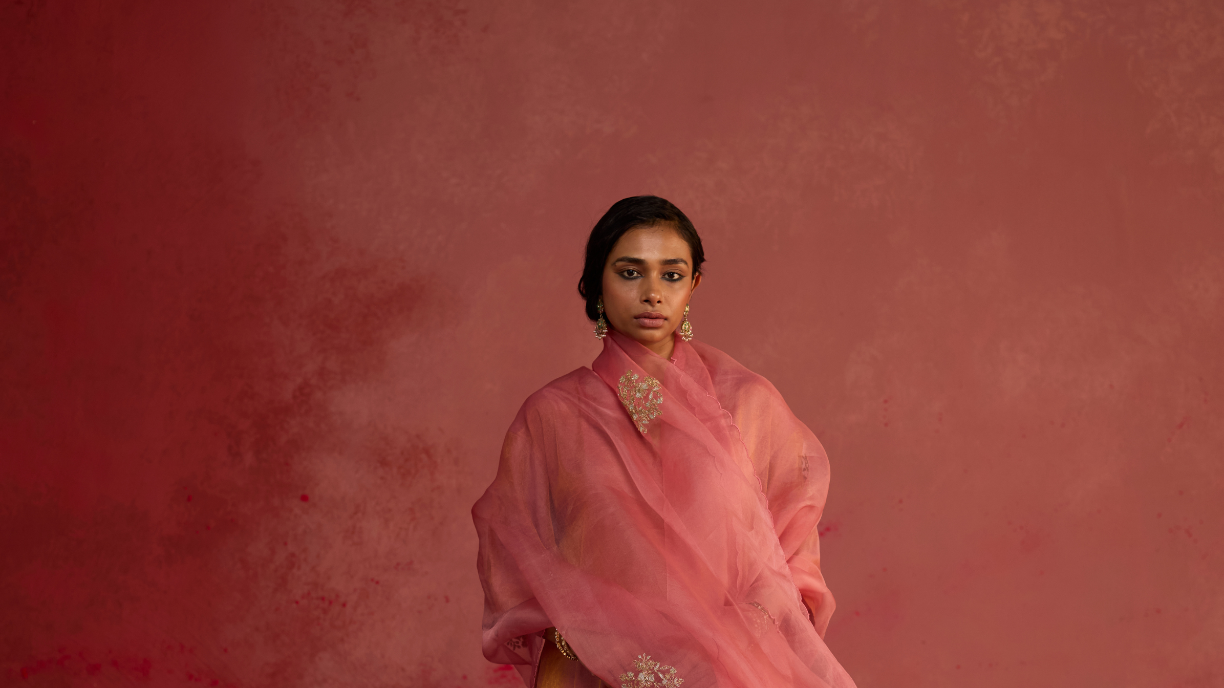 Ahana - Light Green Organza Saree Paired with a Chanderi Blouse and Adorned with Handcrafted Ari-Zardozi Embroidery
